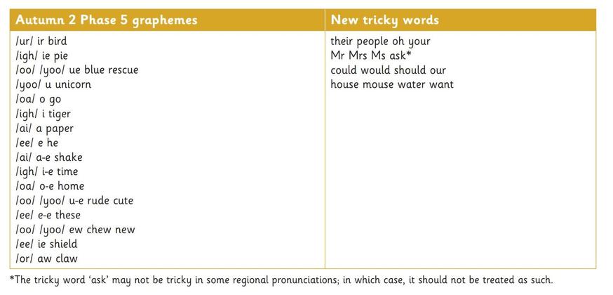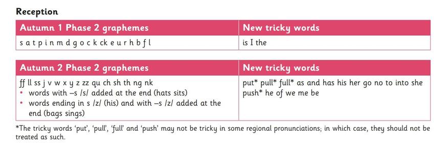 This programme overview shows the progression of GPSs and tricky words that we teach term-by-term. The progression has been organised so that children are taught from the simple to more complex GPCs, as well as taking into account the frequency of their occurence in the most commonly encountered words. All the graphemes taught are practised in words, sentences, and later on, in fully decodable books. Children review and revise GPCs and words, daily, weekly and across terms and years, in order to move this knowledge into their long-term memory.