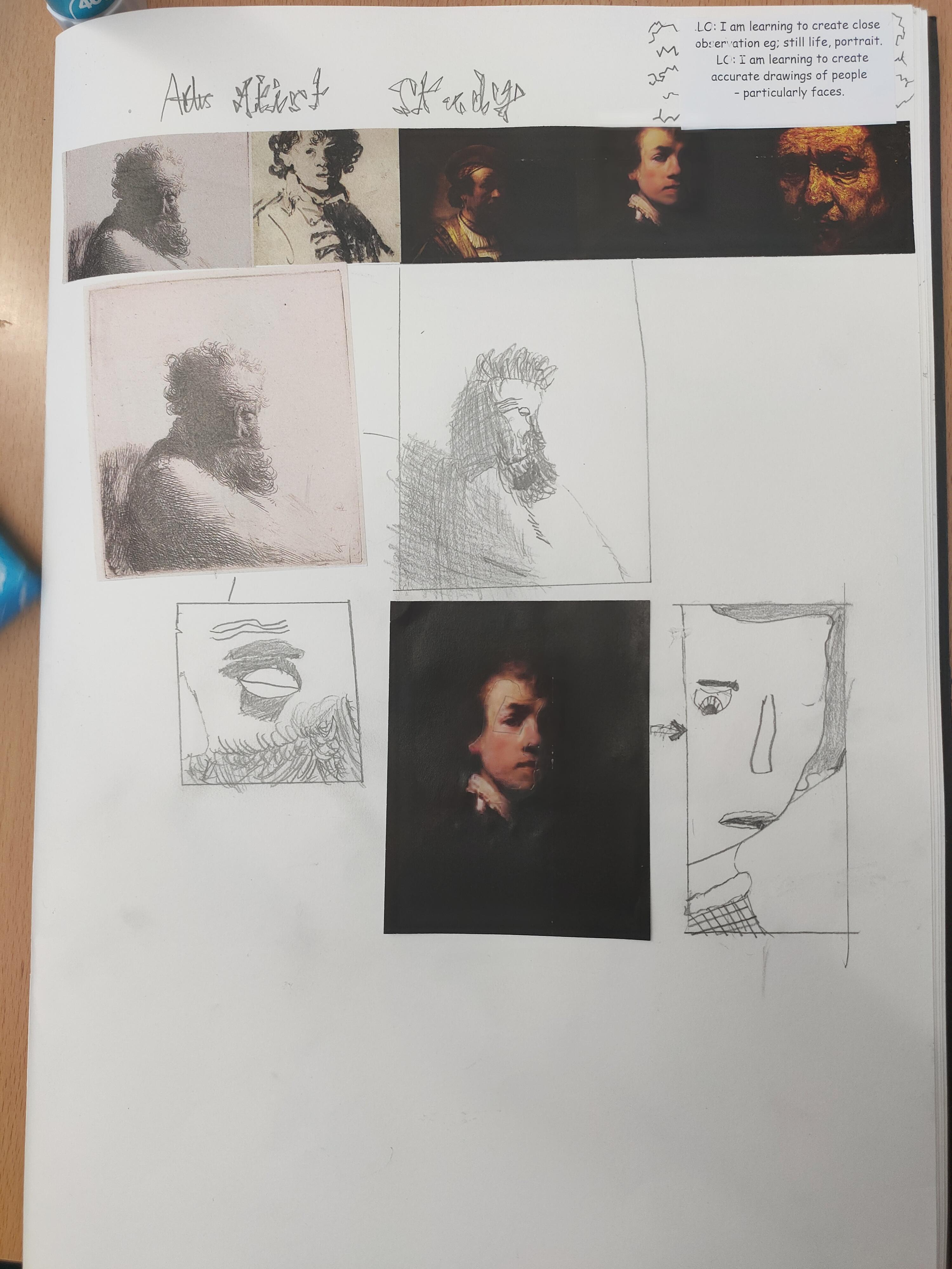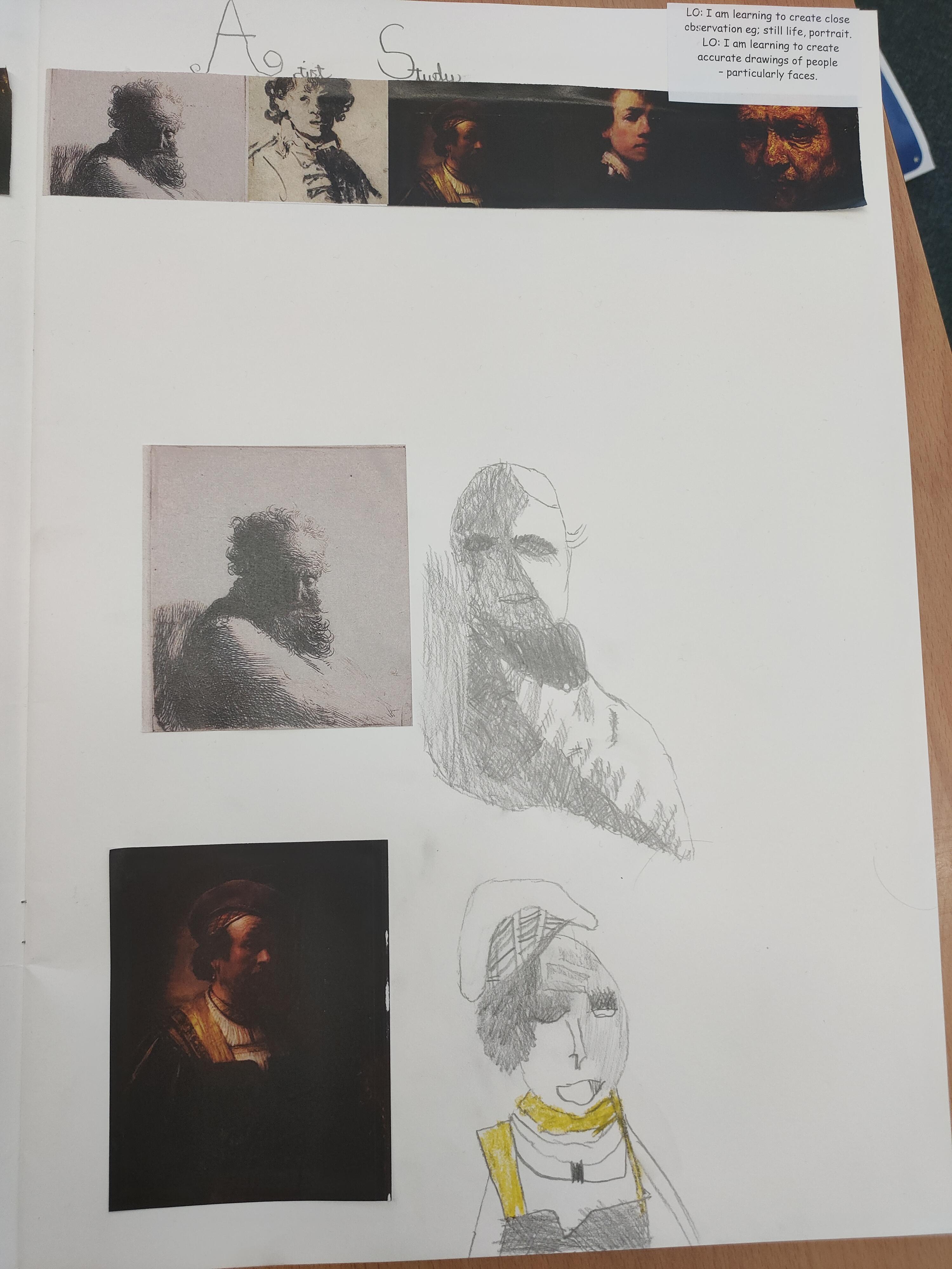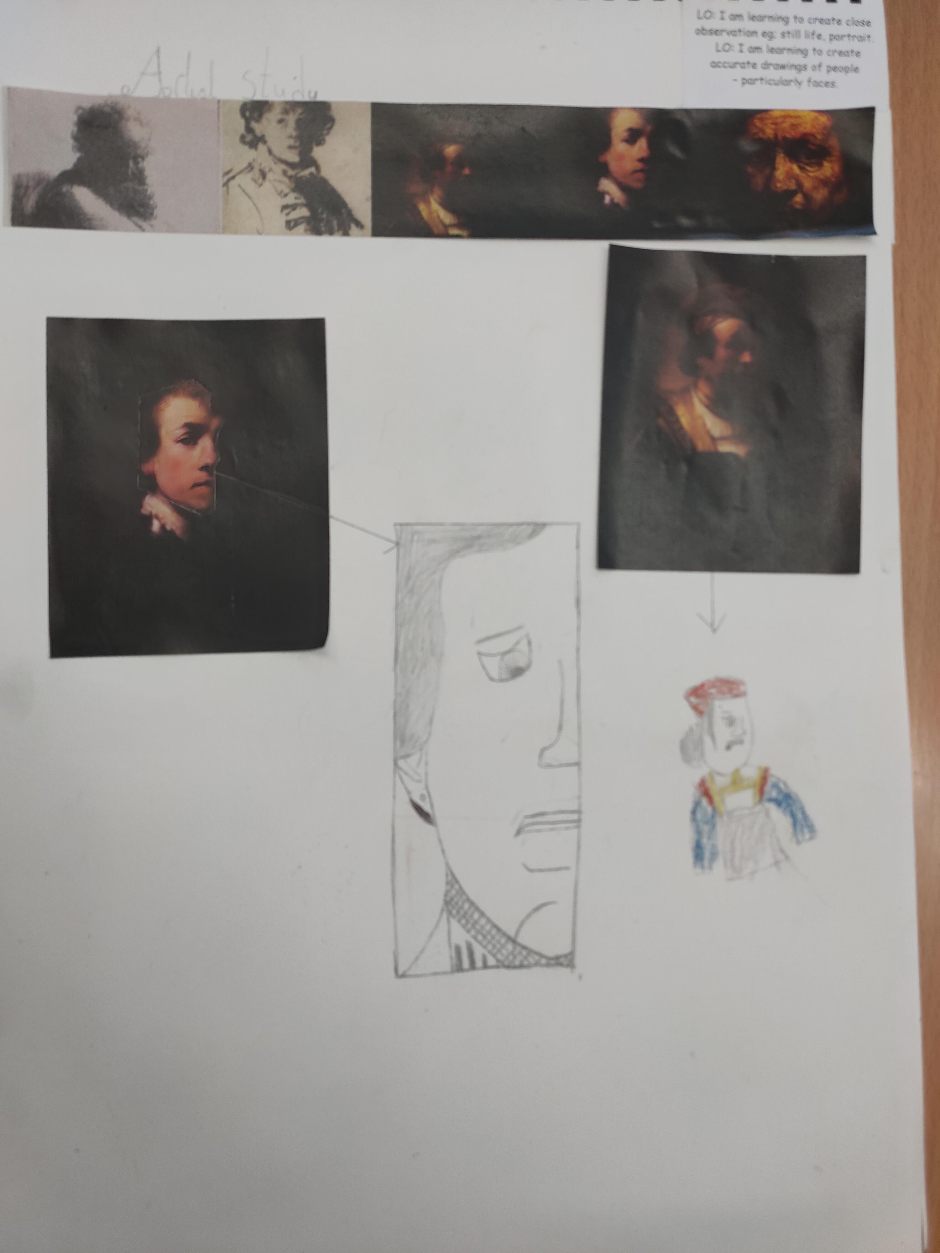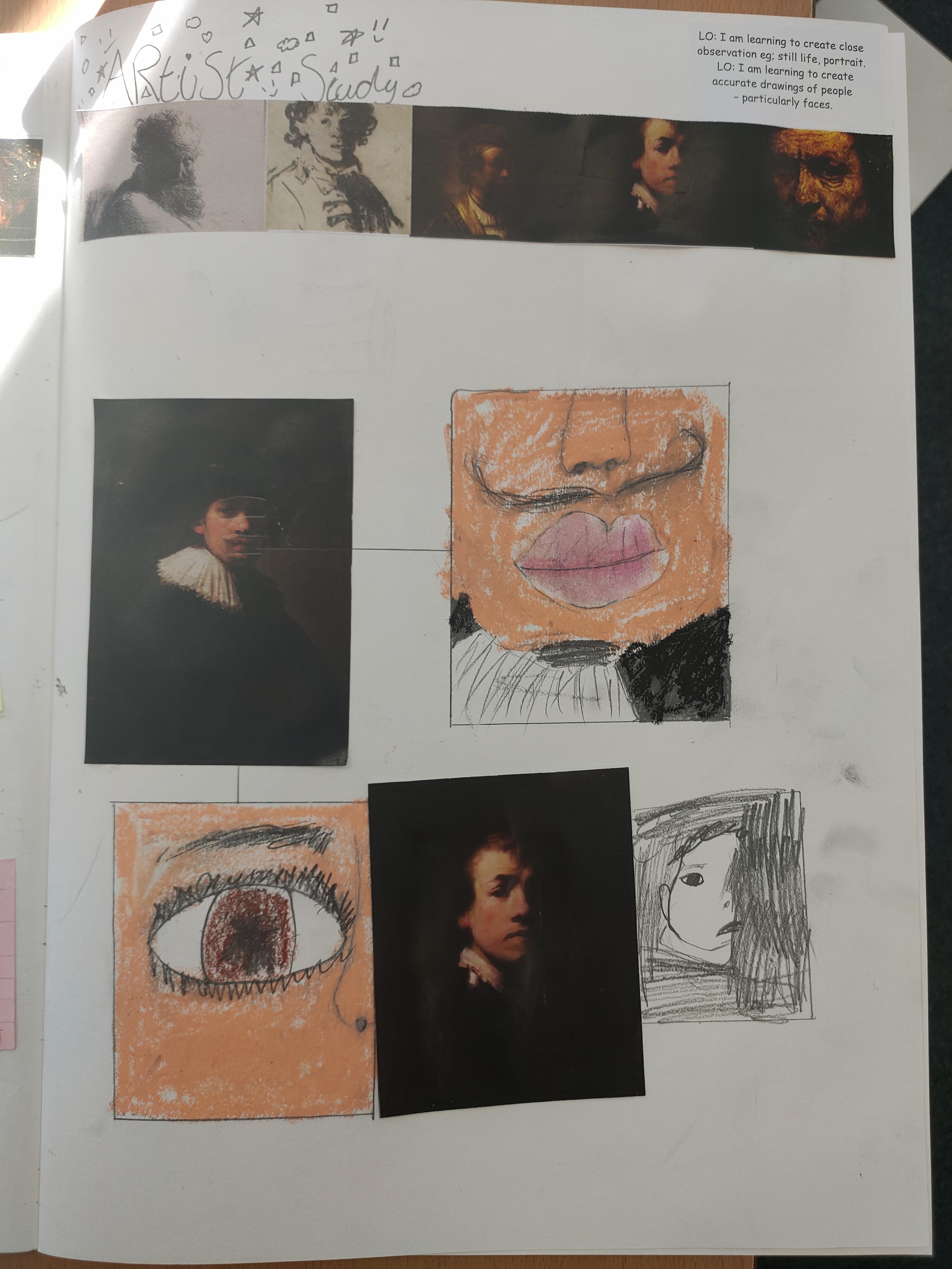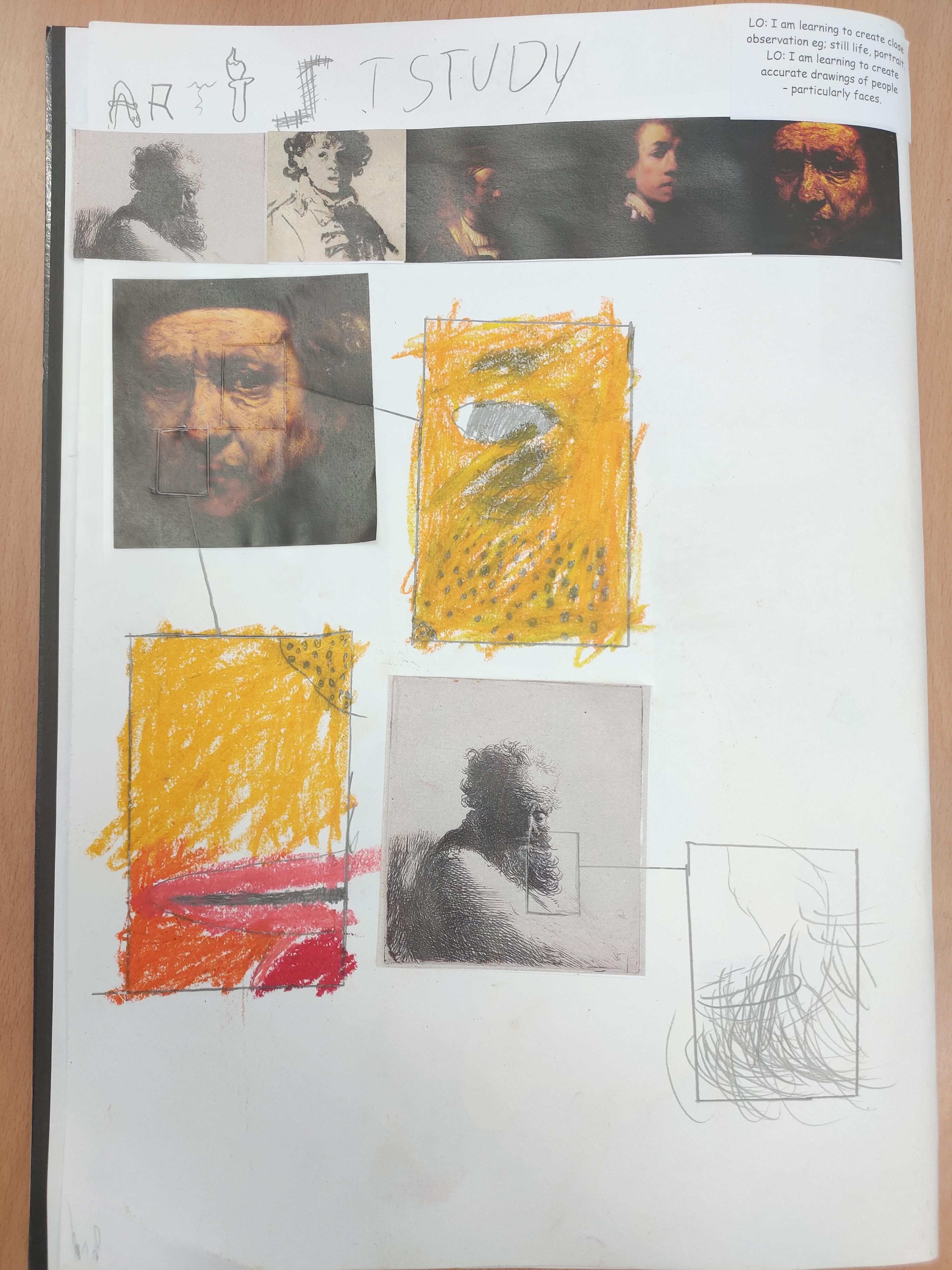 We have created close observation of Rembrandt's work preparing for creating our own portraits in his style. We looked closely at the different marks he made, the shading technique and where the single light source was focussed.